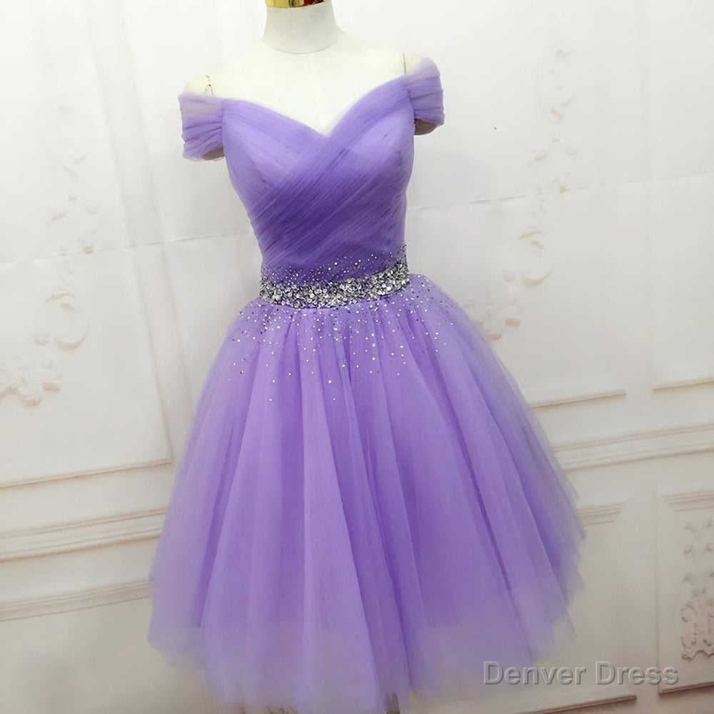 Off The Shoulder V Neck Lilac Rhinestone A Line Tulle Pleated Ruched Homecoming Dresses