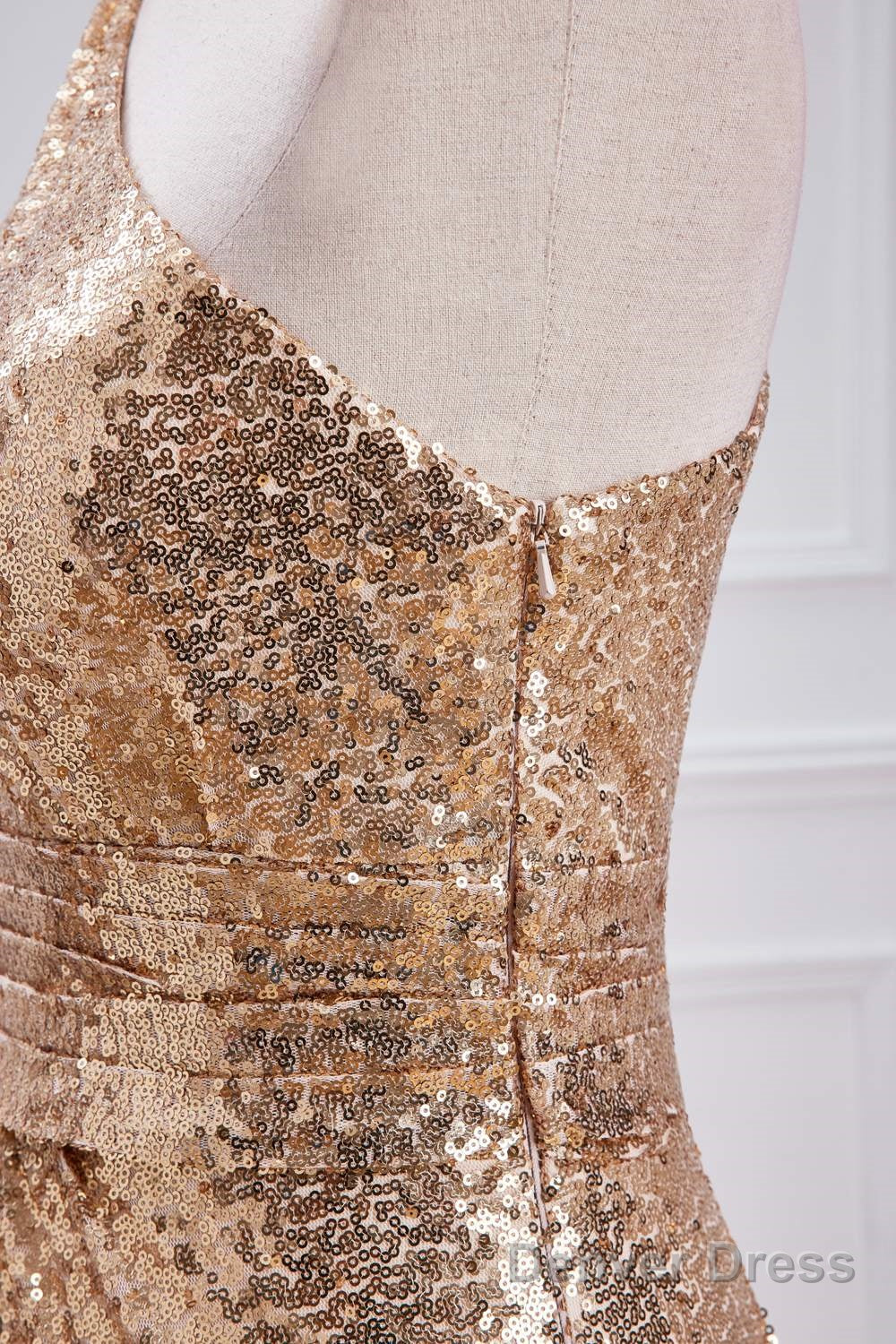 One Shoulder Pleated Gold Sequin Mermaid Bridesmaid Dress
