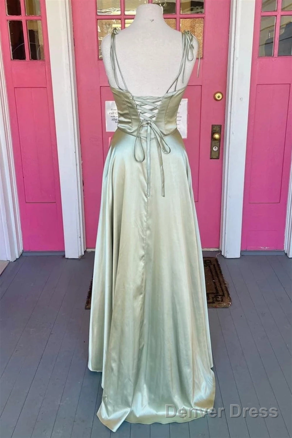 Open Back Sage Satin Long Prom Dress With High Slit, Long Sage Formal Graduation Evening Dress A1617