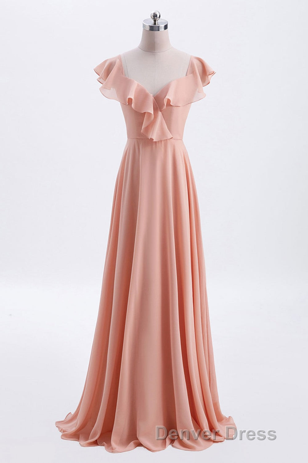 Peach Ruffles A-lline Chiffon Long Bridesmaid Dresses with Tie Back