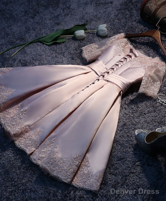 Pink A Line Satin Lace Short Prom Dress, Pink Homecoming Dress
