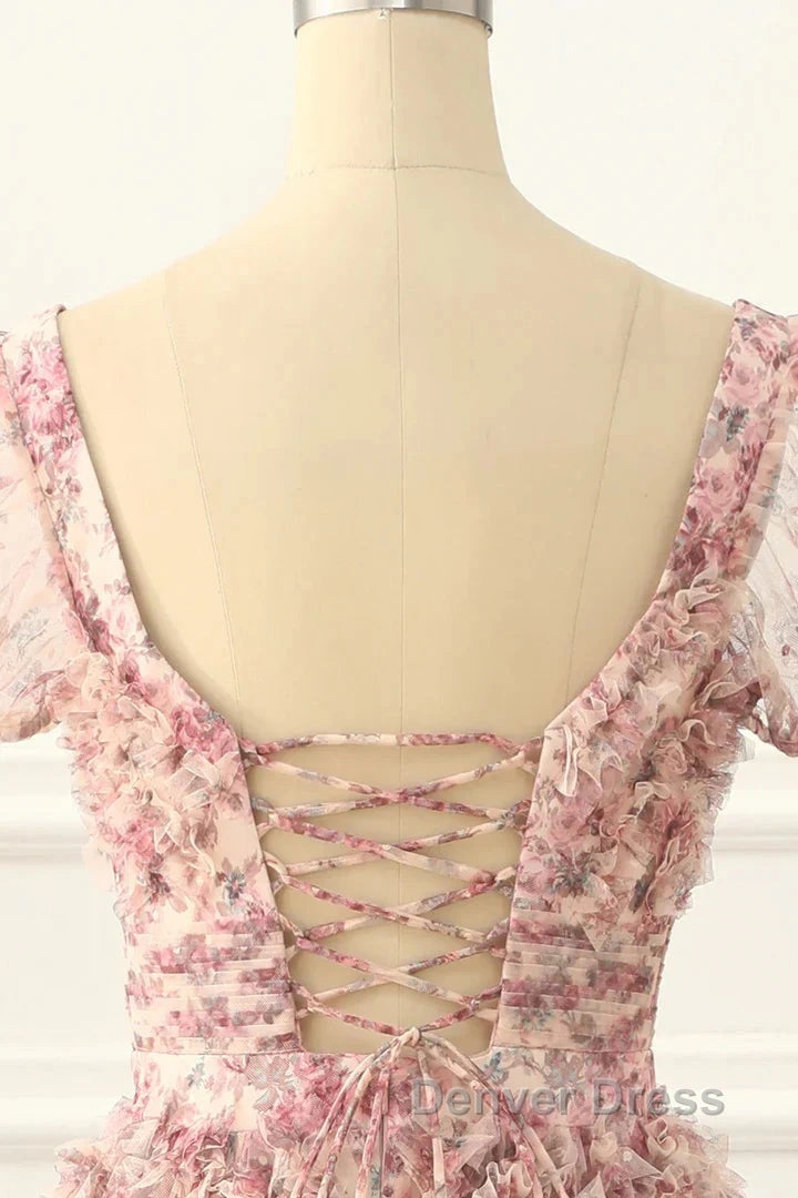 Pink A-Line Tulle Pleated Floral Long Prom Dresses Adult Ceremony Graduation Prom Dresses