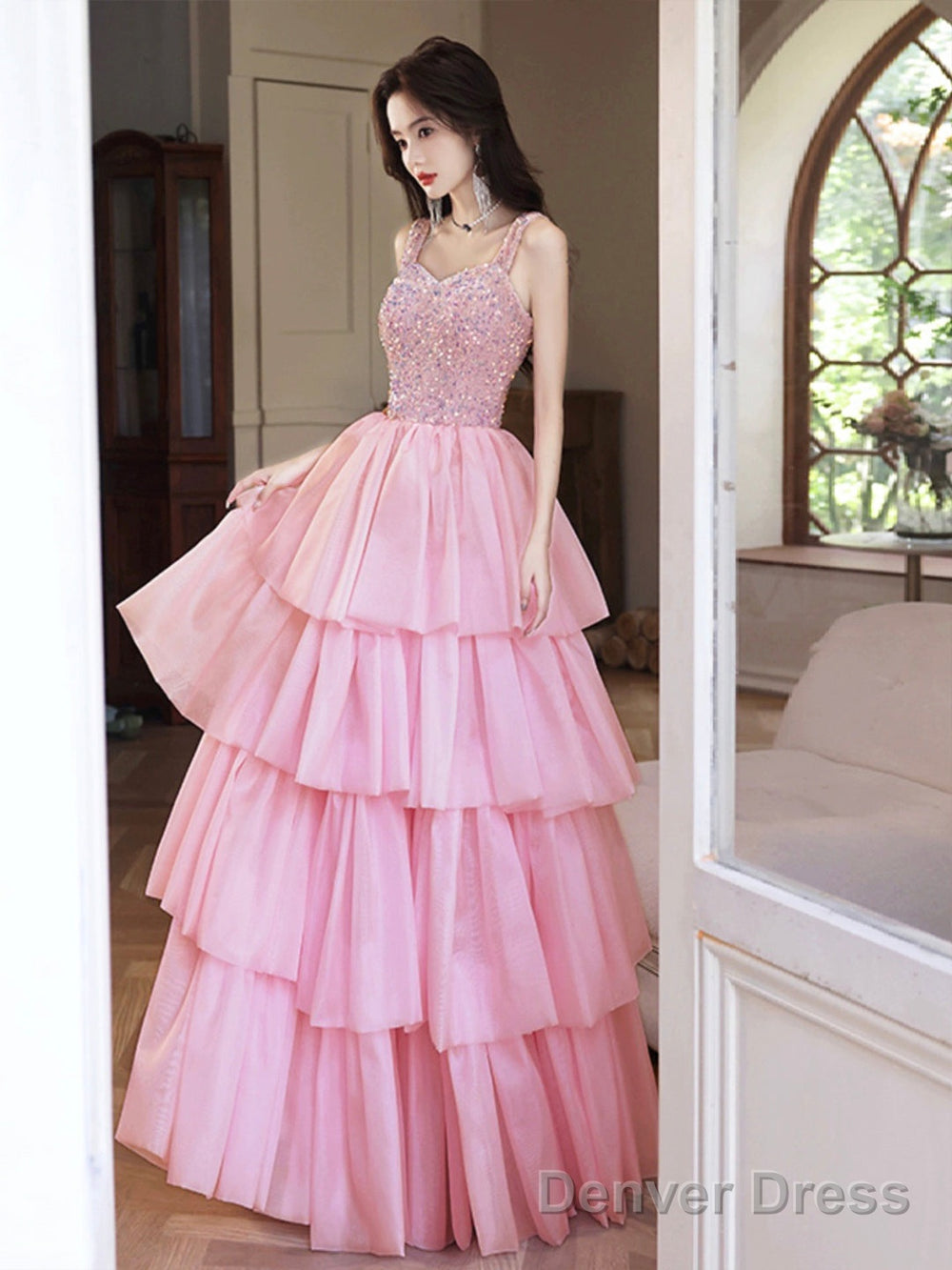 Pink/Blue Tulle Layers Long A-Line Prom Dress, A-Line Spaghetti Strap Sequins Evening Dress