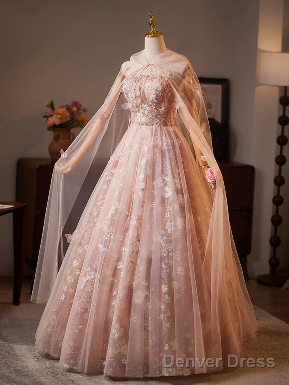Pink Floral Lace Long Party Dress, A-Line Tulle Pink Formal Gown With Cape