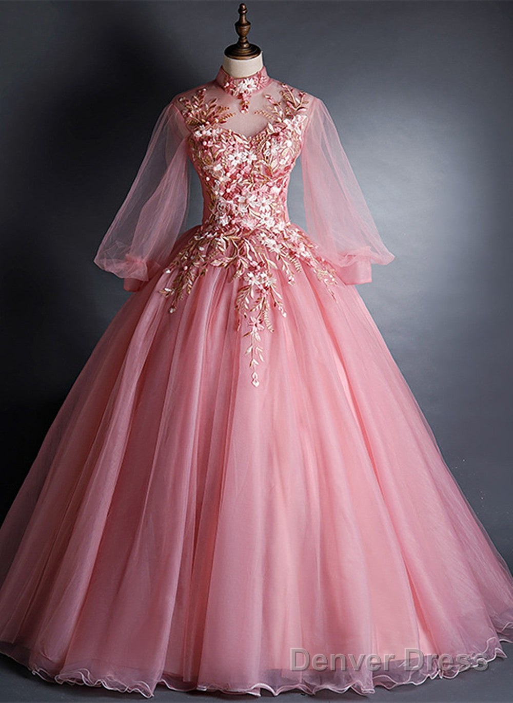 Pink High Neckline Floral Lace Puffy Sleeves Sweet 16 Dress, Pink Tulle Formal Dress