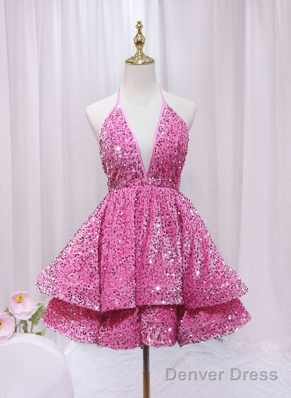 Pink Sequins Halter Backless Short Homecoming Dress, Pink Short Prom Dress