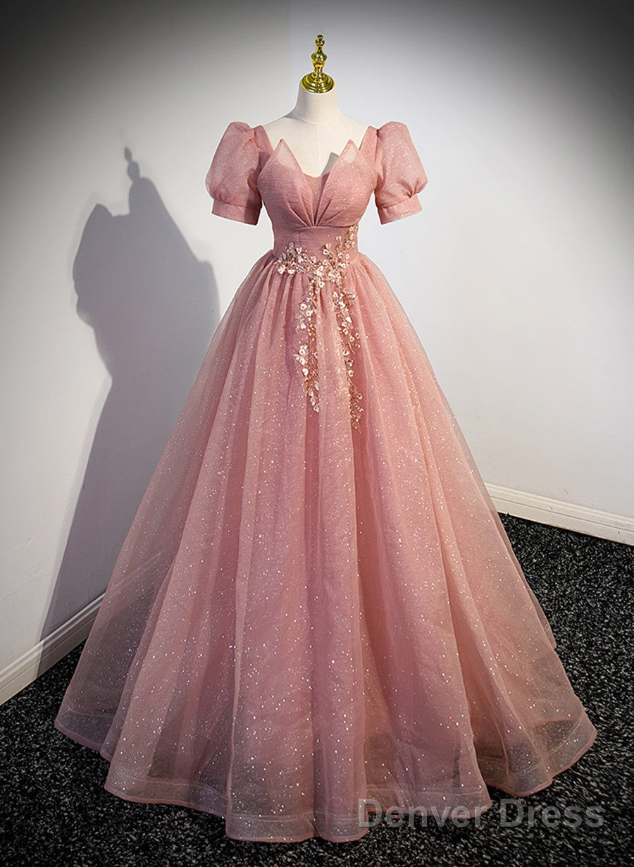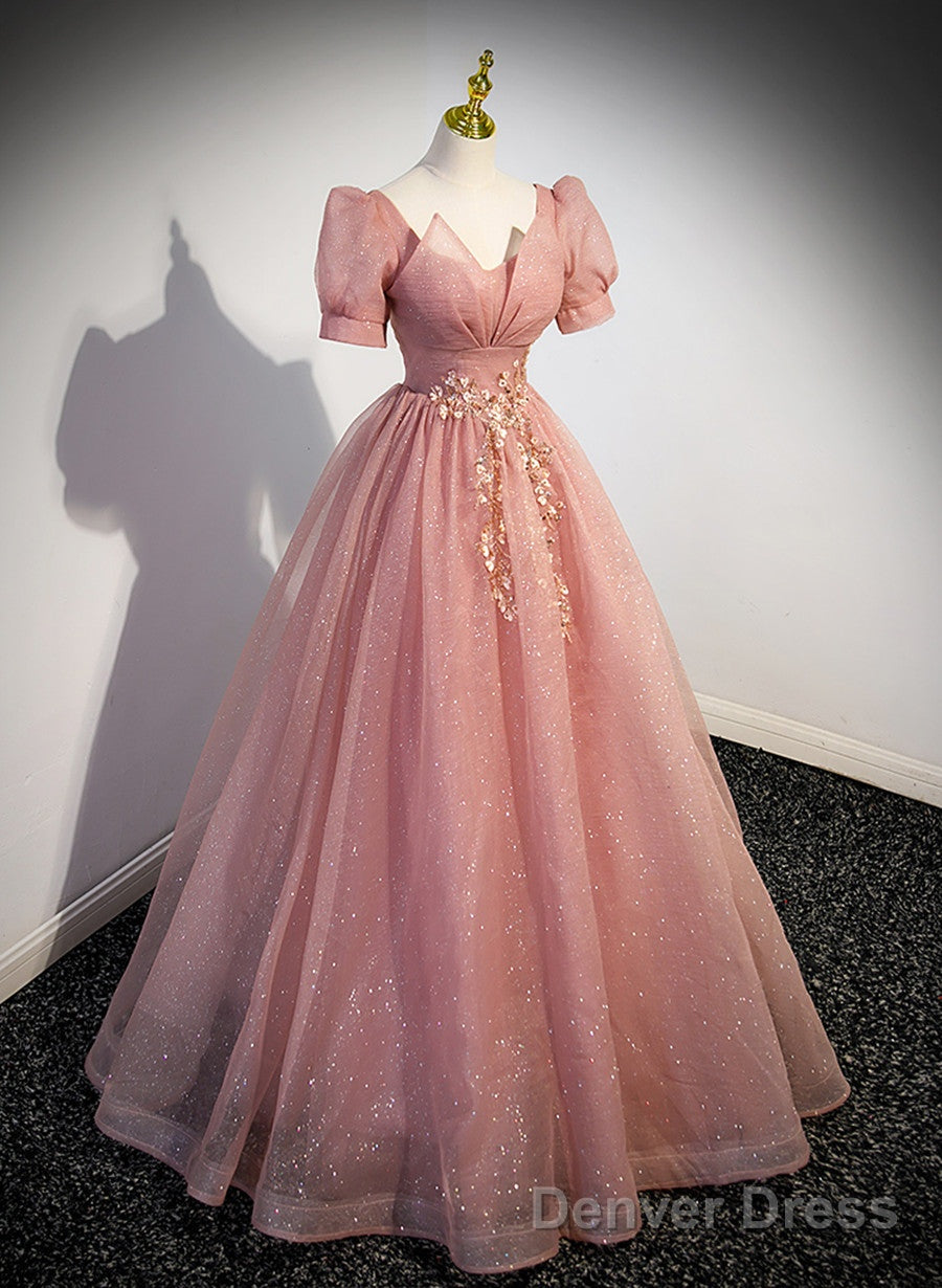 Pink Sweetheart Tulle Short Sleeves Party Dress, Pink Floor Length Formal Dress