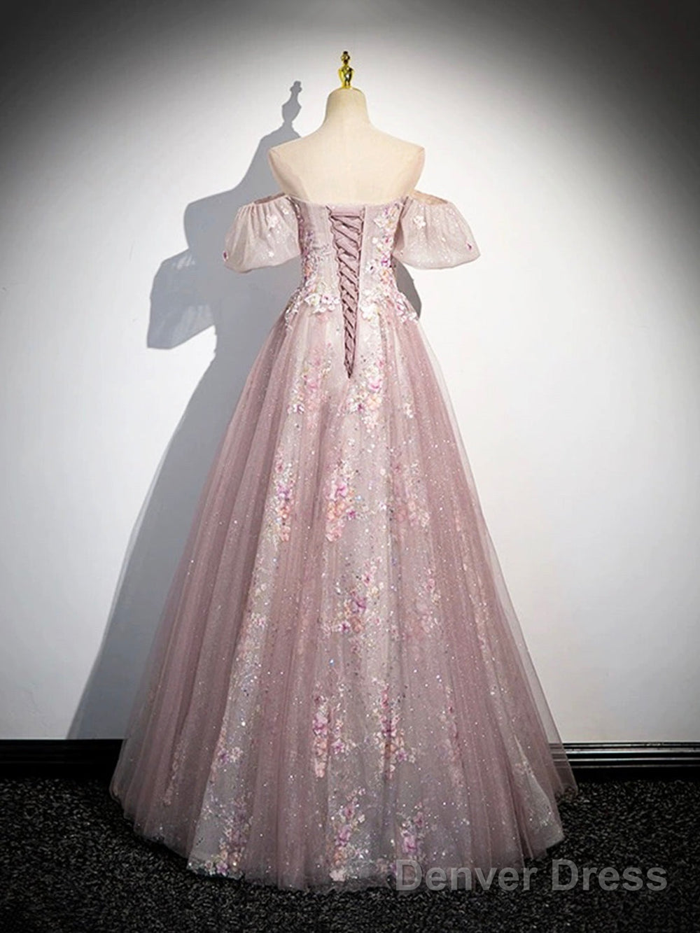 Pink Tulle Lace Long Prom Dress With Beaded, A-Line Off The Shoulder Evening Party Dress