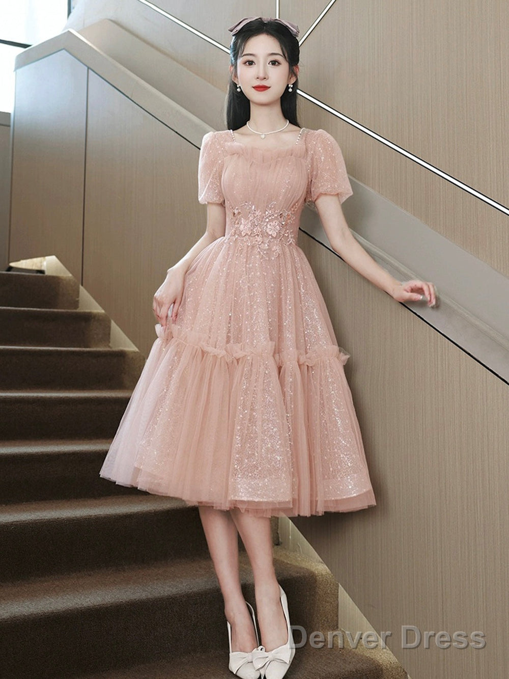 Pink Tulle Sequins Sweetheart Short Prom Dress, Pink Short Sleeve Party Dress