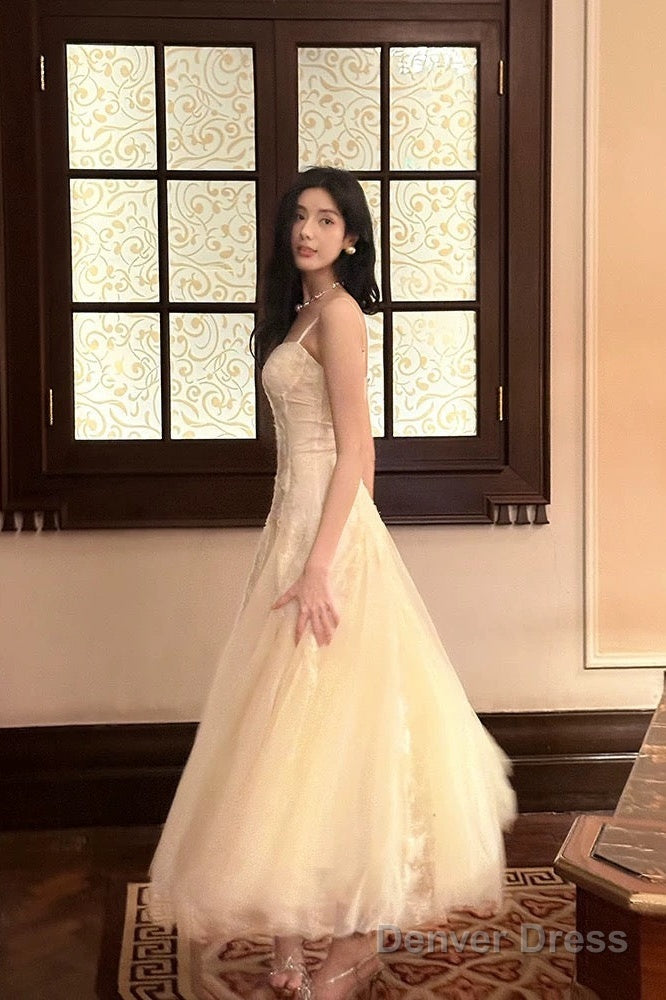 Pretty A Line Spaghetti Straps Tulle Chamapgne Ankle Length Evening Dress Prom Dresses