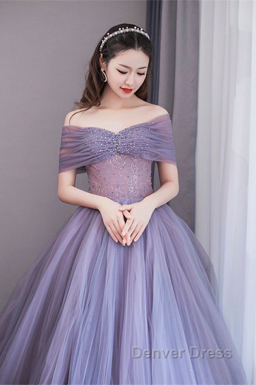 Purple Beaded Tulle Ball Gown Formal Dresses, Off Shoulder Sweet 16 Formal Dresses