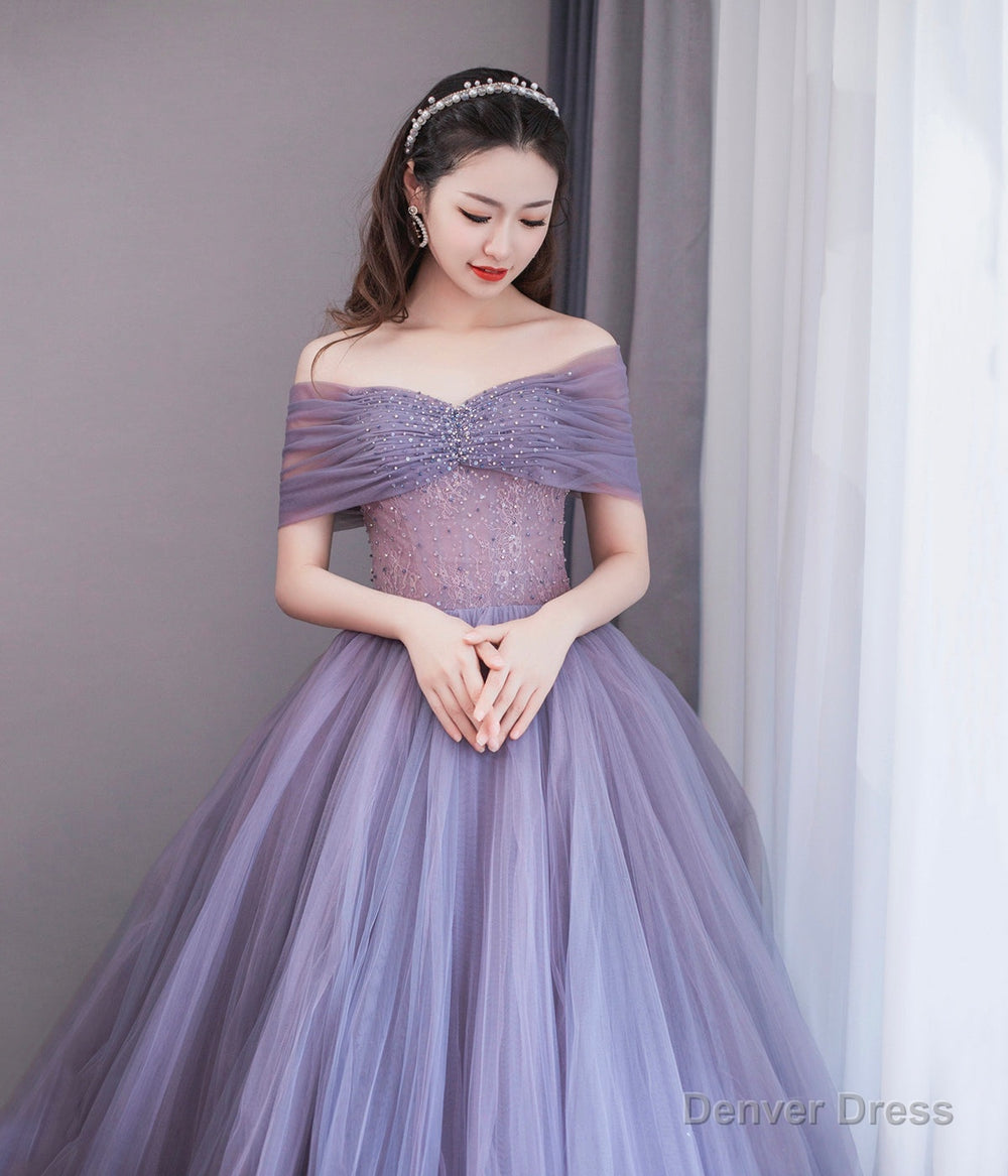 Purple Tulle Beaded Long Prom Dress, Off Shoulder Evening Party Dress