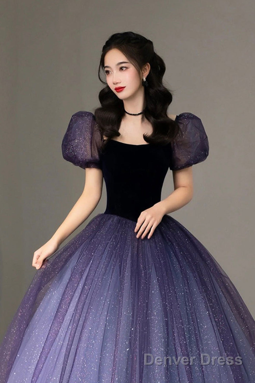 Purple Tulle Long Princess Dress, Cute Short Sleeve Formal Evening Dress
