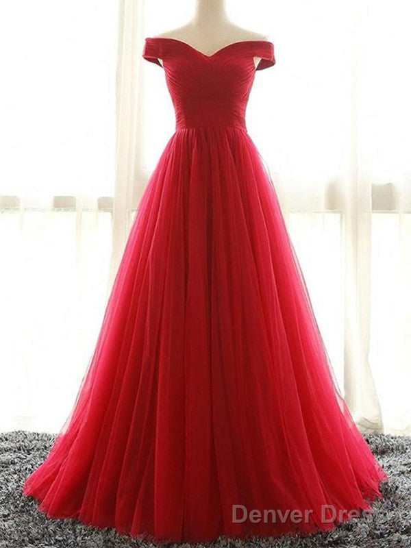Red A Line Off Shoulder Floor Length Tulle Prom Dress, Off Shoulder Graduation Dress, Red Formal Dress
