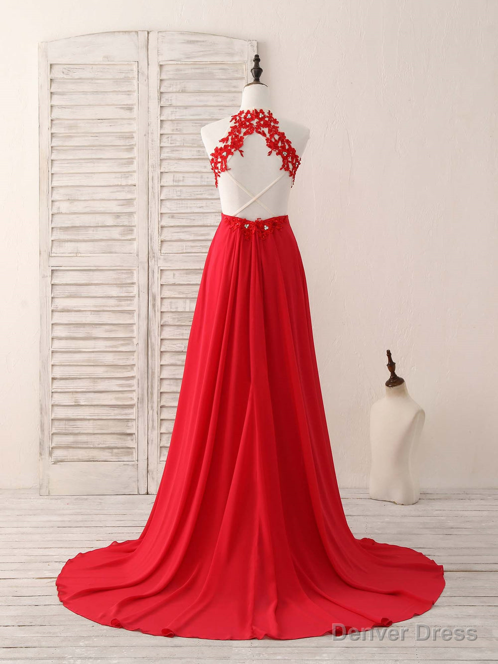 Red Hight Neck Chiffon Lace Applique Long Prom Dress, Red Formal Dress
