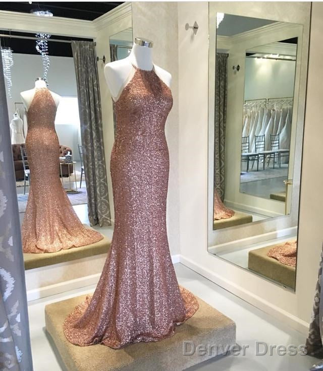 Rose Gold Sequins Halter Bridesmaid Dresses Long Mermaid Gowns