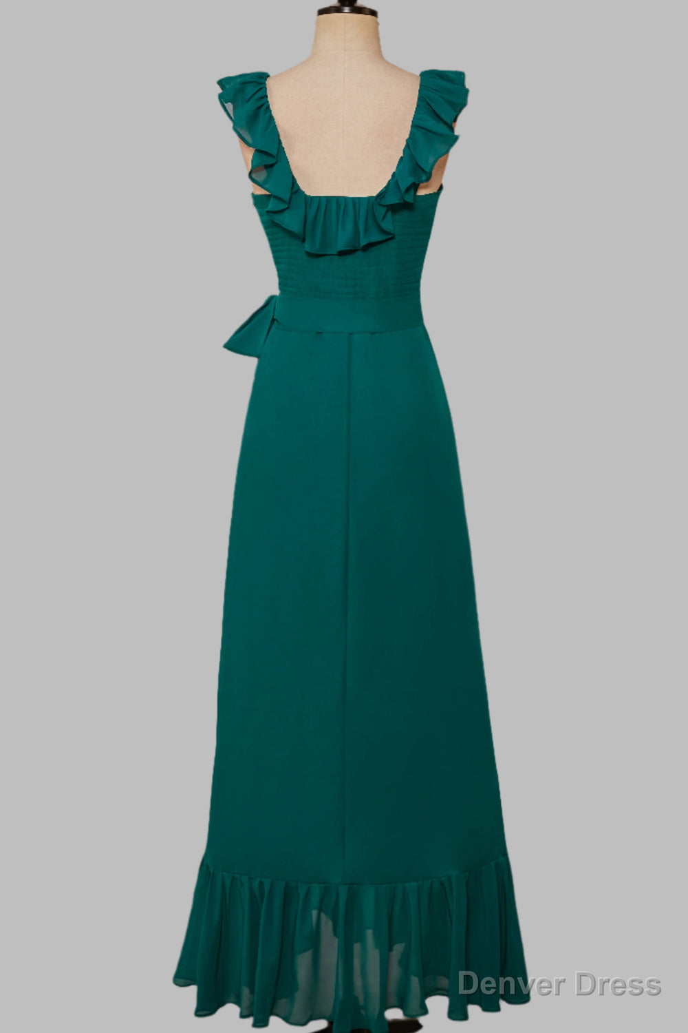 Ruffled Crew Neck Emerald Chiffon Midi Bridesmaid Dress