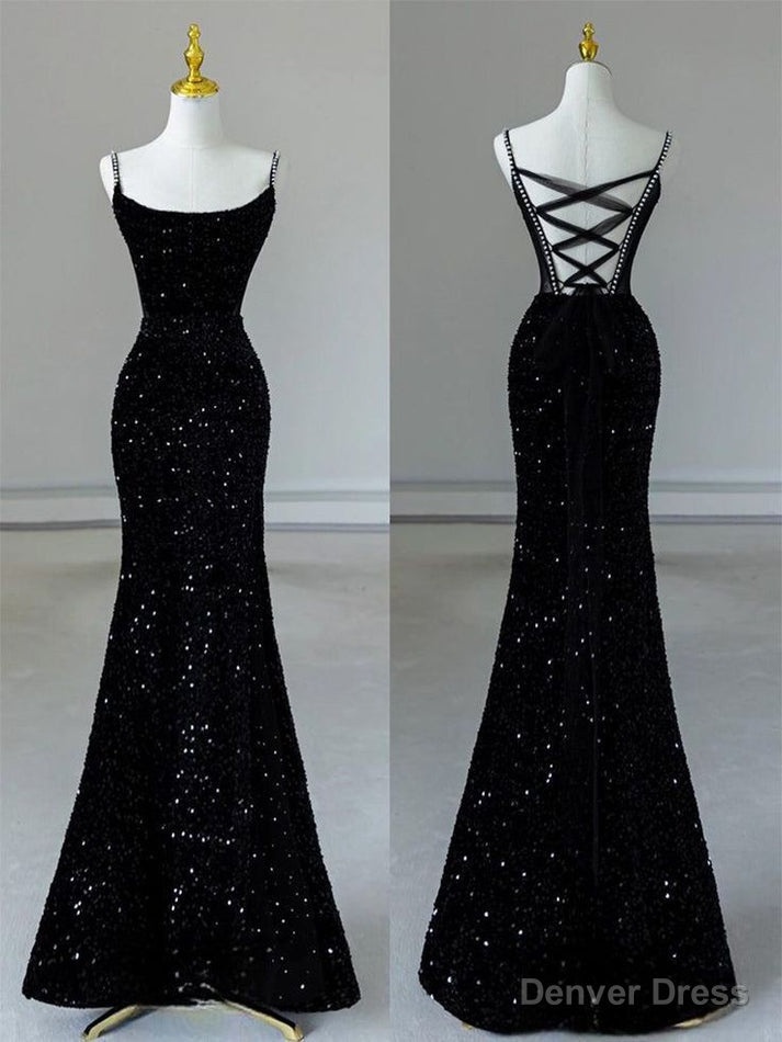 Sexy Mermaid Spaghetti Straps Sequin Black Long Prom Dresses