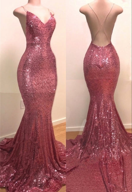 Pink Spaghetti Strap V Neck Sequins Mermaid Prom Dresses | Long Evening Dresses