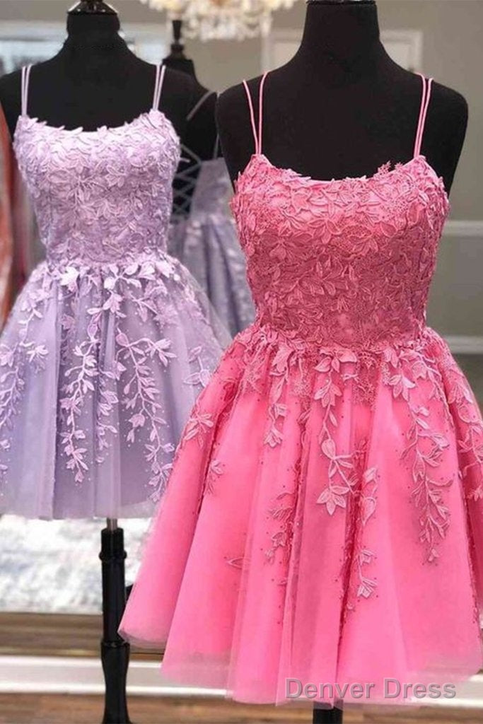 Short A Line Thin Straps Purple/Hot Pink Lace Prom Dress, Purple/Hot Pink Lace Homecoming Dress, Lilac/Hot Pink Short Formal Dress