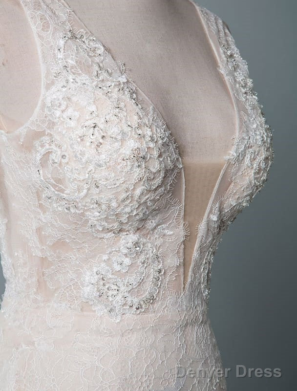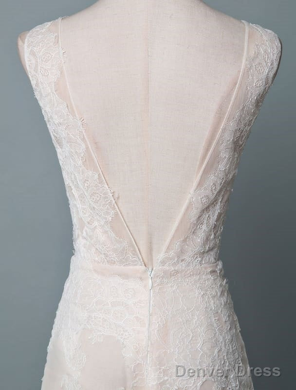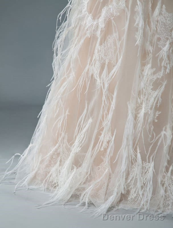 Simple Wedding Dress Lace A Line V Neck Sleeveless Beaded Floor Length Feather Bridal Gowns