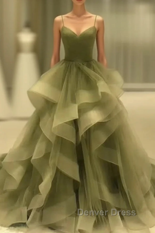 Spaghetti Strap Green A Line Long Prom Dresses Formal Evening Gown Party Dresses