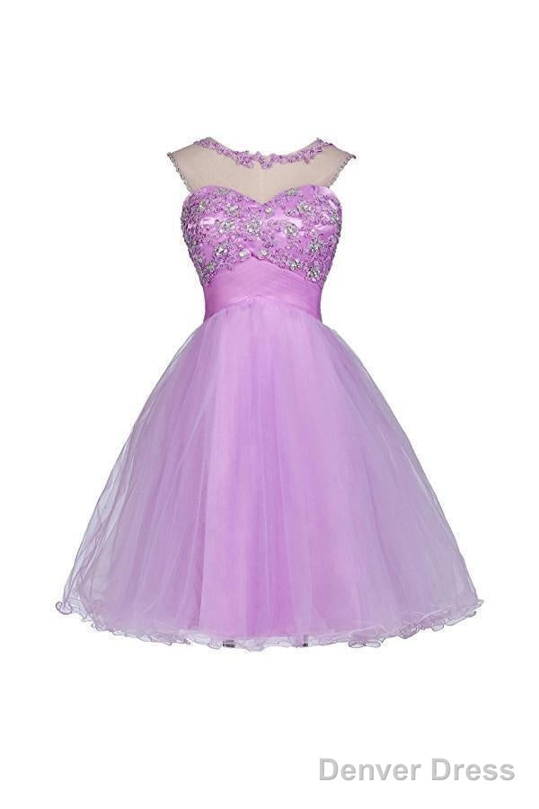 Tulle Appliques Beads Open Back Short Purple Homecoming Dresses