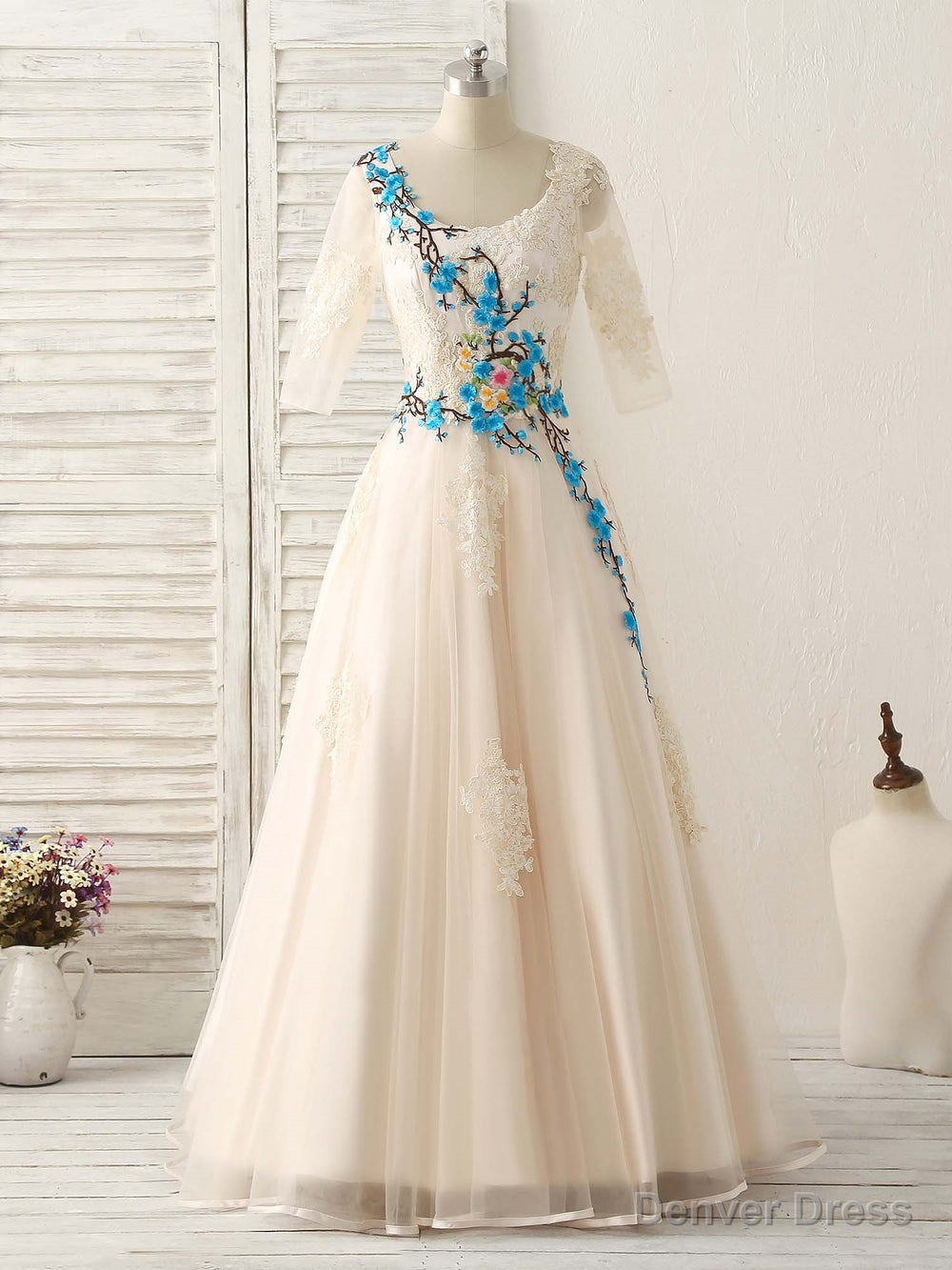 Unique Lace Applique Tulle Long Prom Dress Light Champagne Bridesmaid Dress