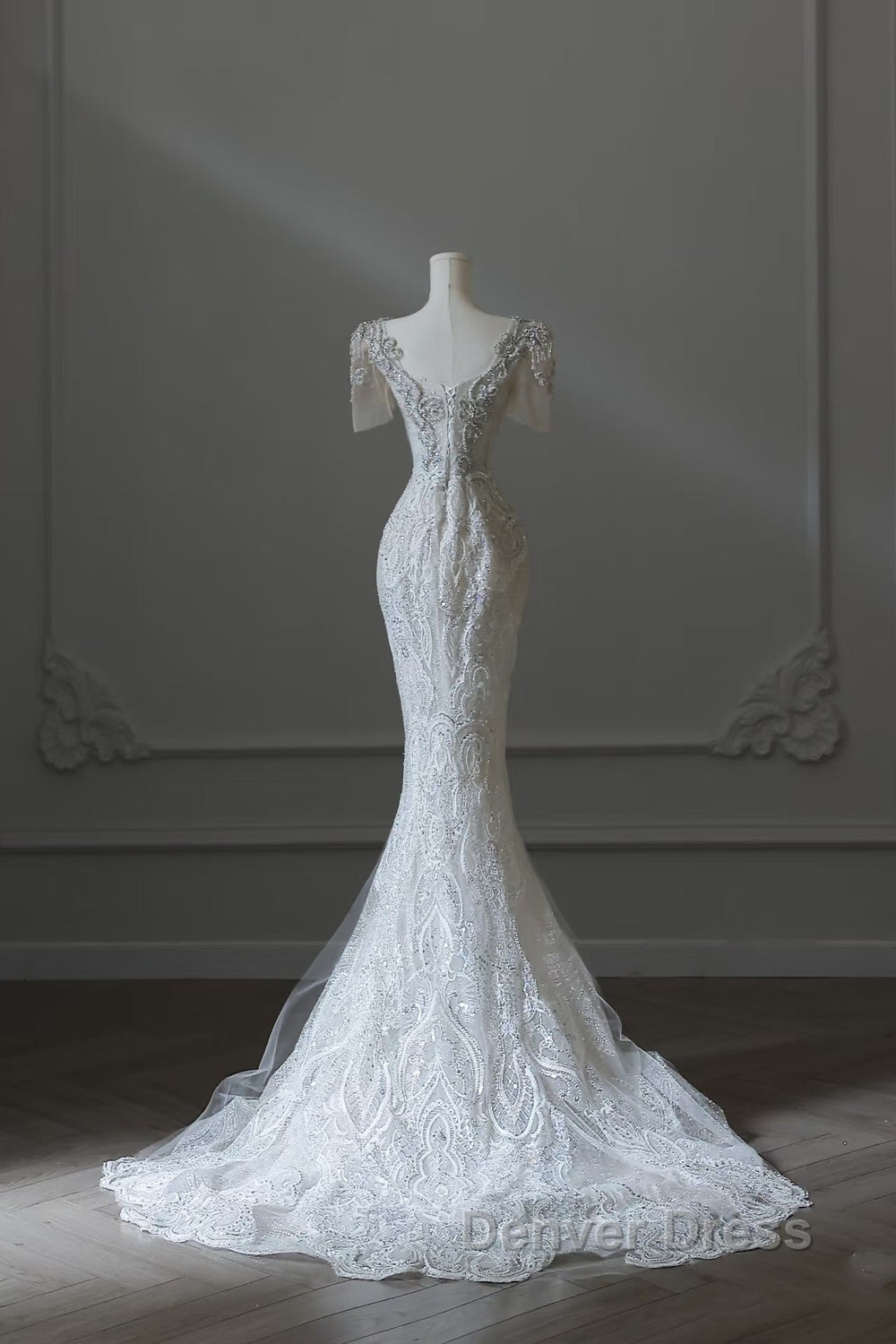 Unique Mermaid Square Neckline Short Sleeves Wedding Dresses White Brides Dresses