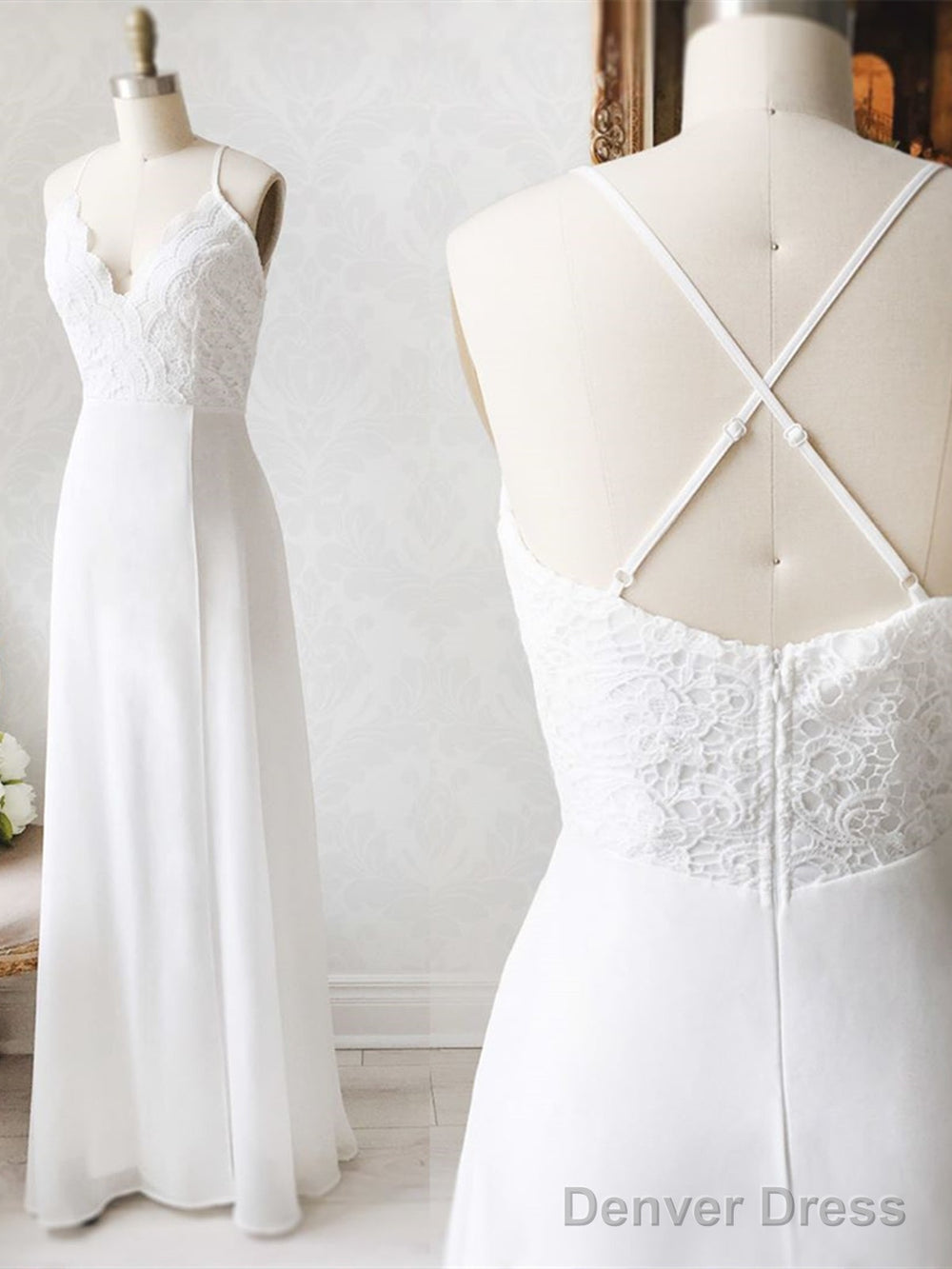 V Neck Backless White Lace Prom Dresses, Open Back White Lace Wedding Bridesmaid Dresses