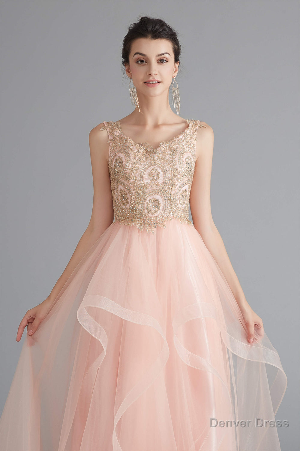 V-Neck Beaded Applique Asymmetrical Sleeveless Tulle Prom Dresses