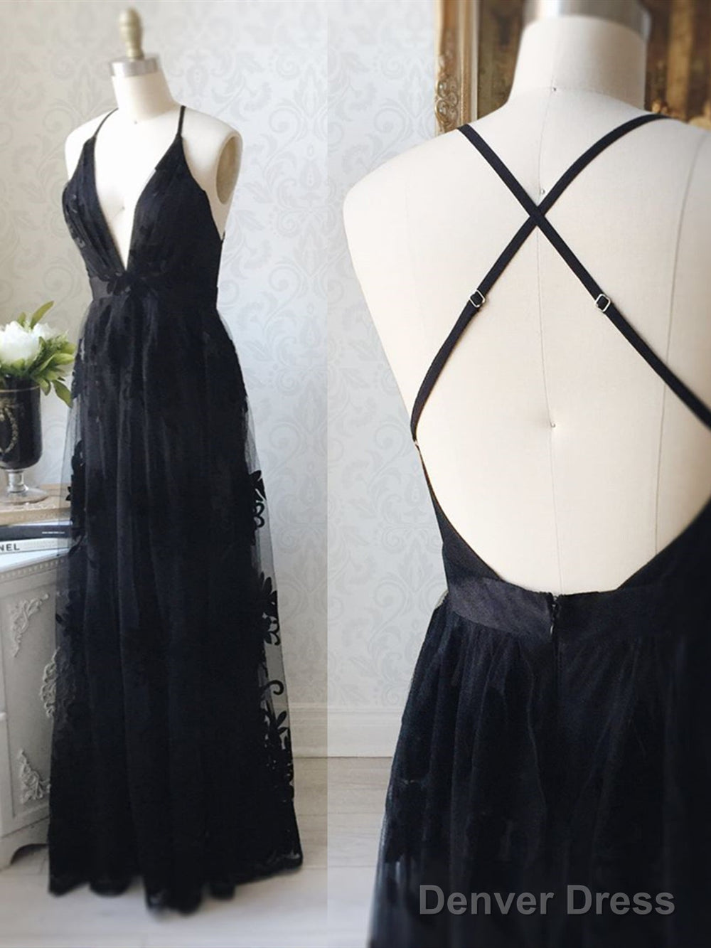 V Neck Black Backless Lace Prom Dresses, Open Back Black Lace Formal Evening Bridesmaid Dresses