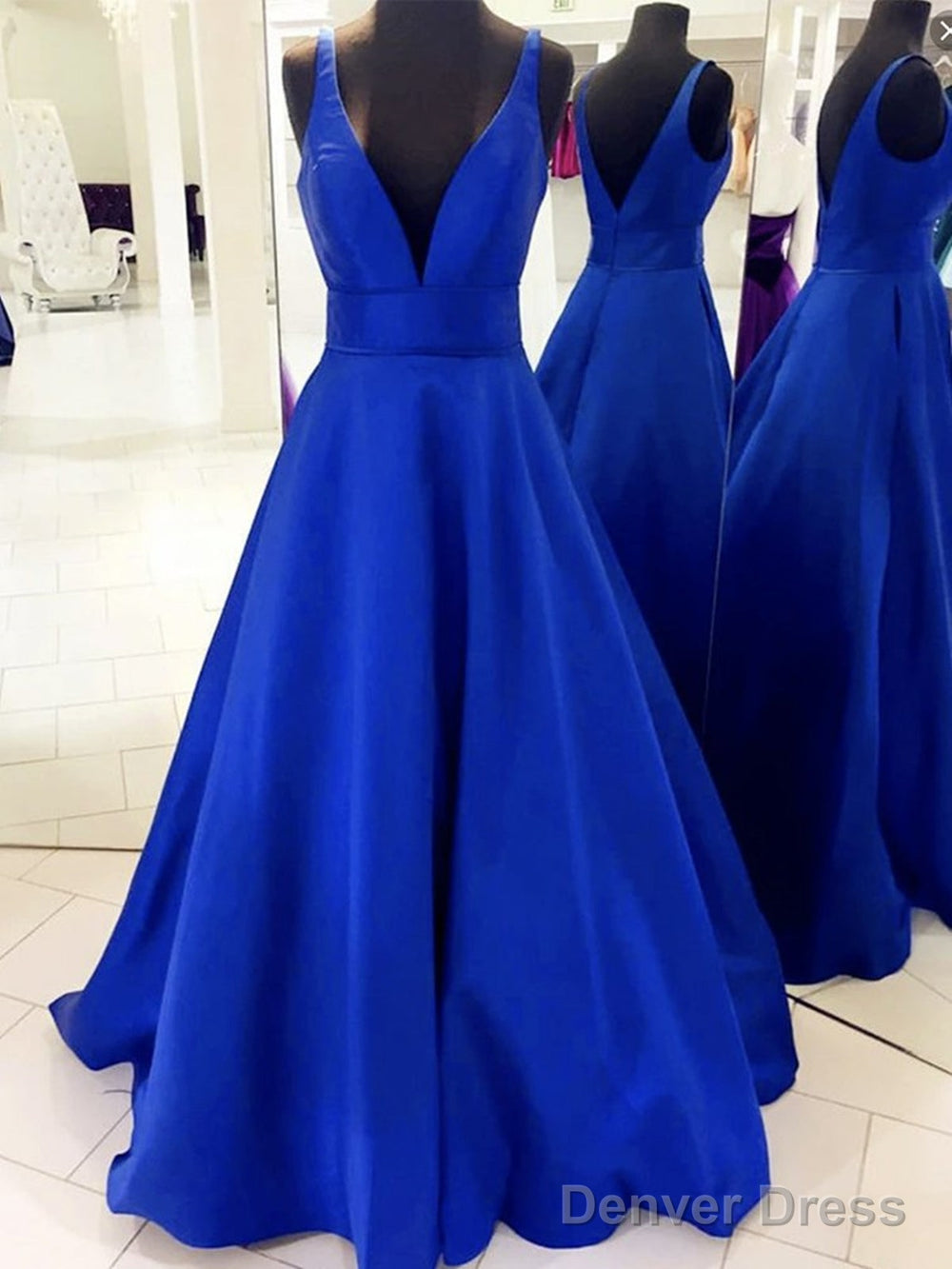V Neck Royal Blue Satin Prom Dresses, Royal Blue Satin Formal Evening Bridesmaid Dresses