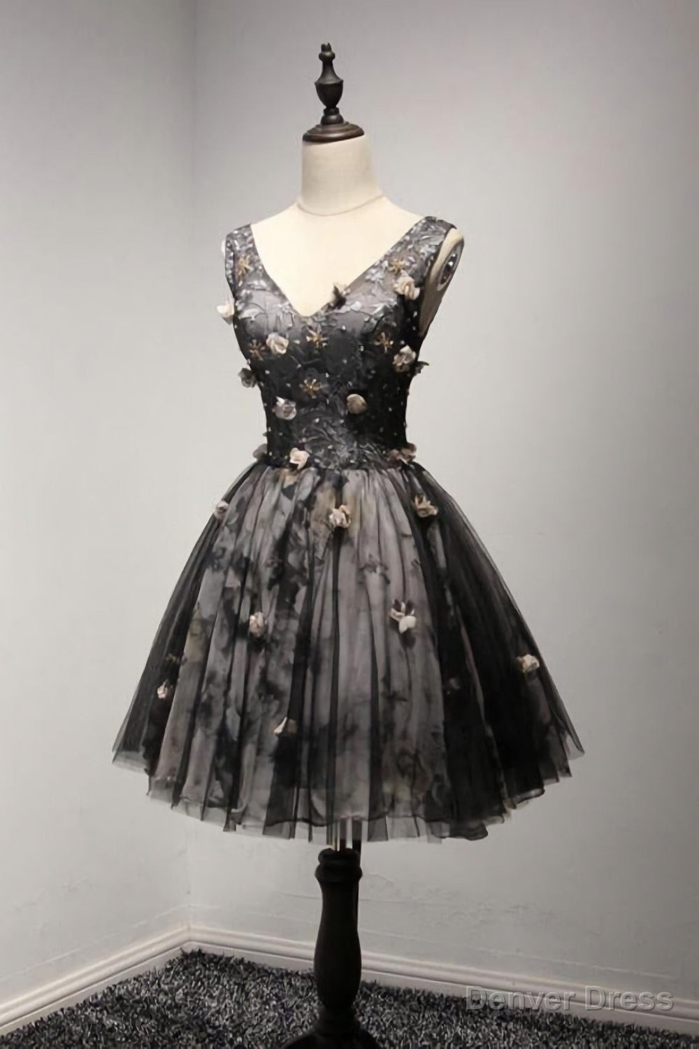 V Neck Short Black Lace Homecoming Prom Dresses, Short Party Prom Dresses