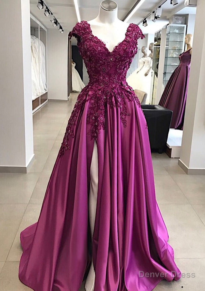 Vintage Prom Dresses 90S, A-line/Princess V Neck Sleeveless Long/Floor-Length Satin Prom Dress with Appliqued Beading Split