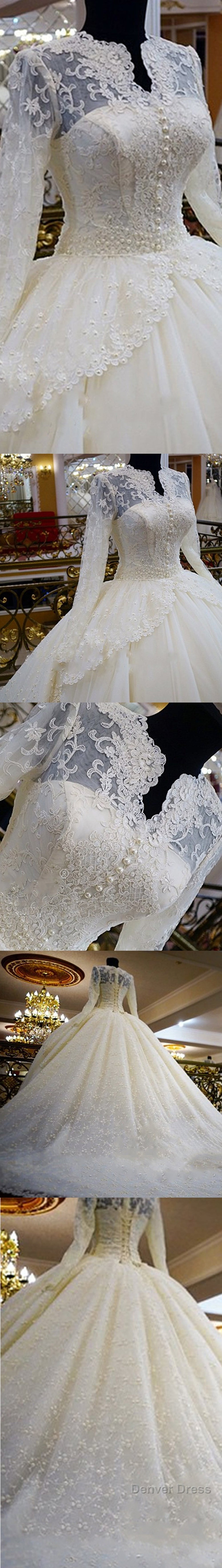 Vintage Unique Gorgeous Ball Gown Full Ivory Lace Beading Long Sleeve Elegant Lace Up Back Wedding Dress