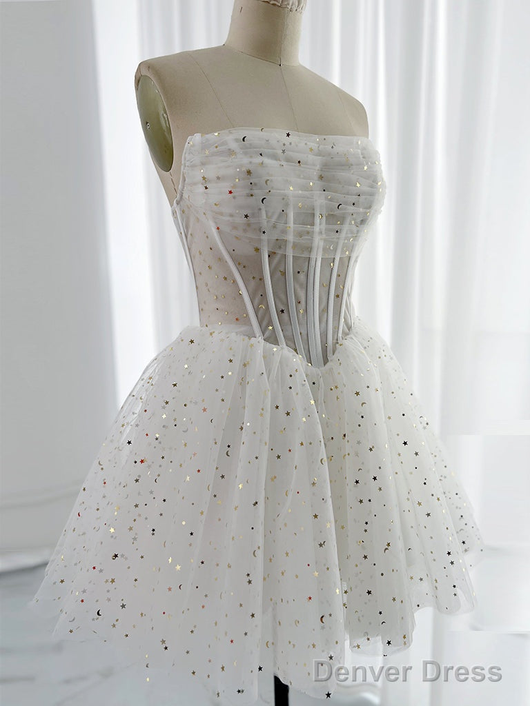 White A-Line Tulle Star Short Prom Dress, White Cute Homecoming Dress