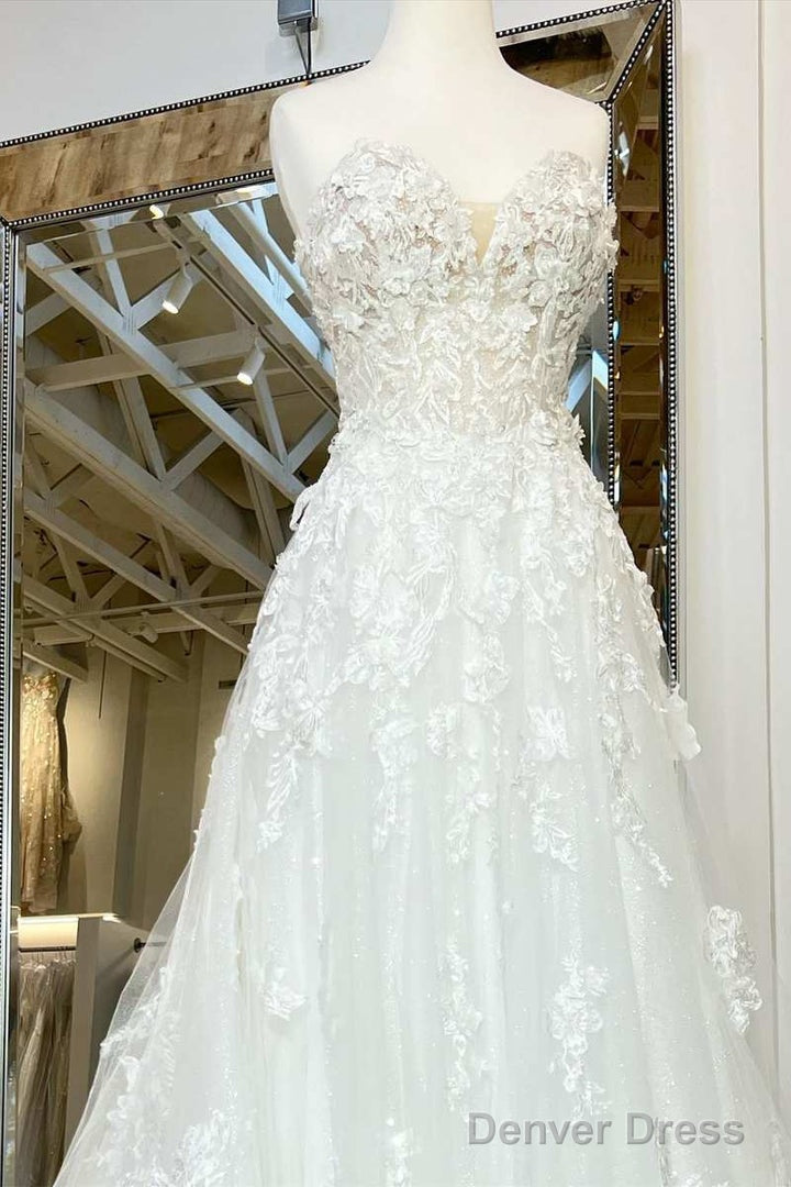 White Floral Applique Sweetheart Long Wedding Dress With Sweeping Train Beautiful