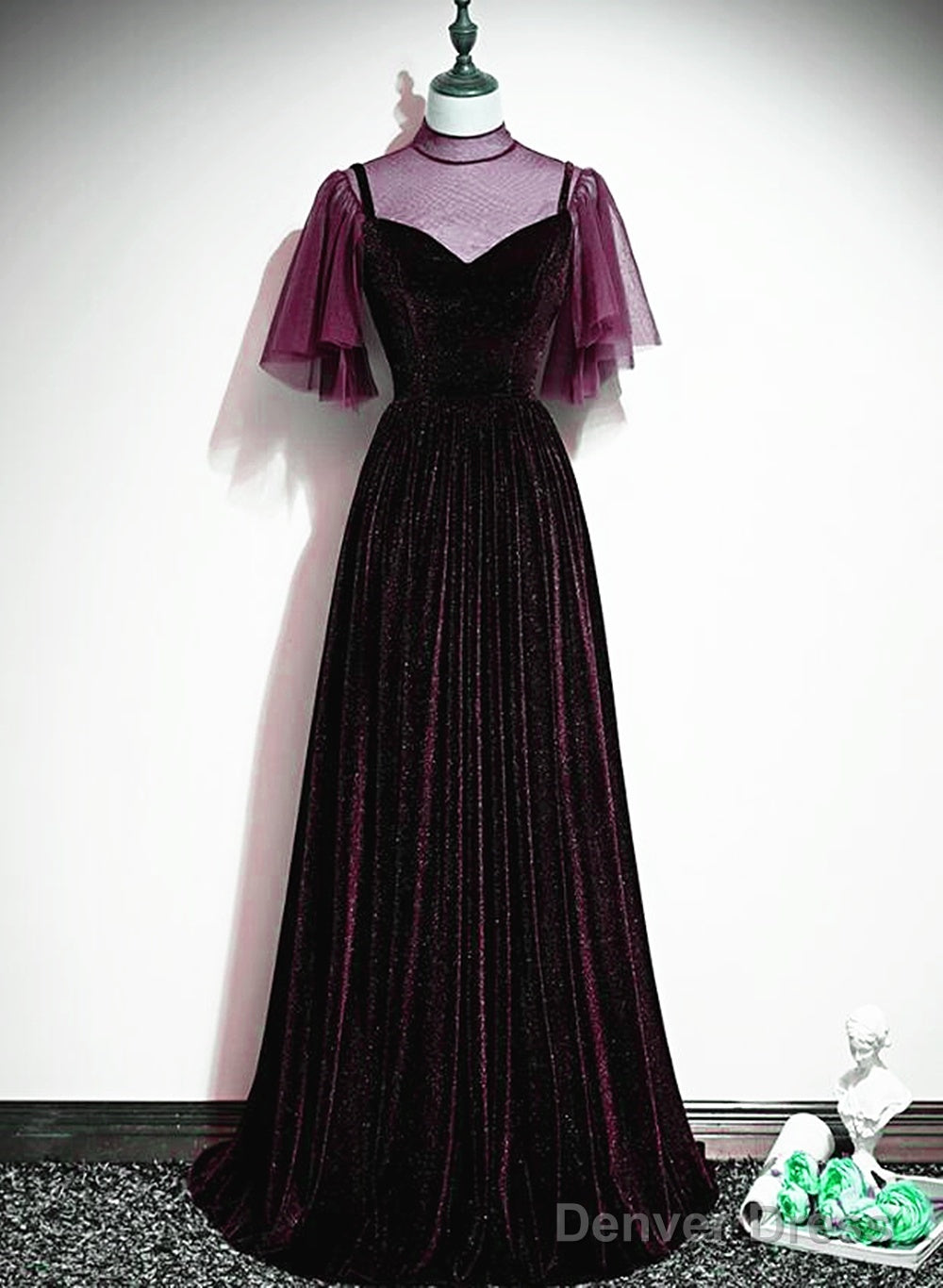 Wine Red Velvet A-Line Long High Neckline Party Dress, Wine Red Long Bridesmaid Dress